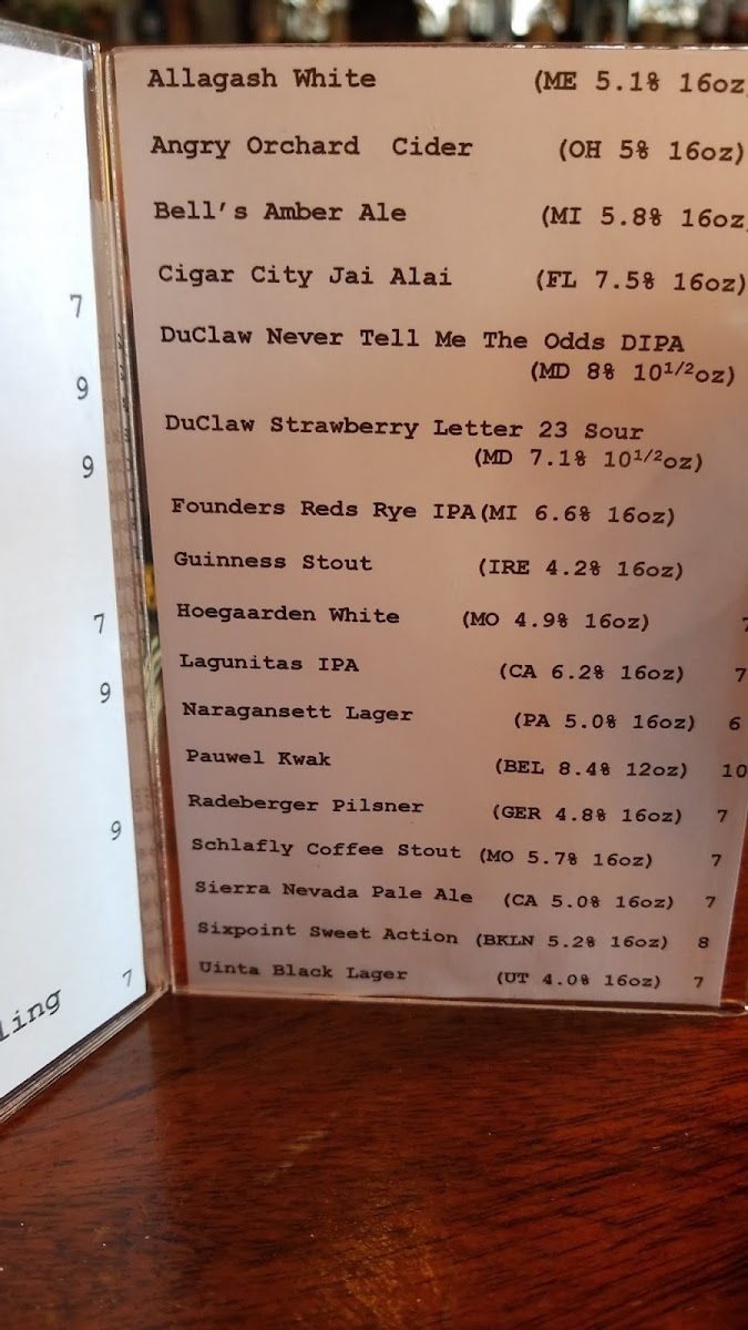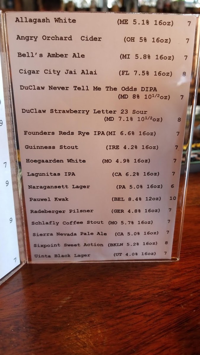 - Other Beers and Ciders: Additional options cover popular choices like Allagash White, Angry Orchard Cider, Bell’s Amber Ale, Cigar City Jai Alai, and Duclaw specialty brews. These beverages offer a broader range for patrons seeking different flavor profiles.
